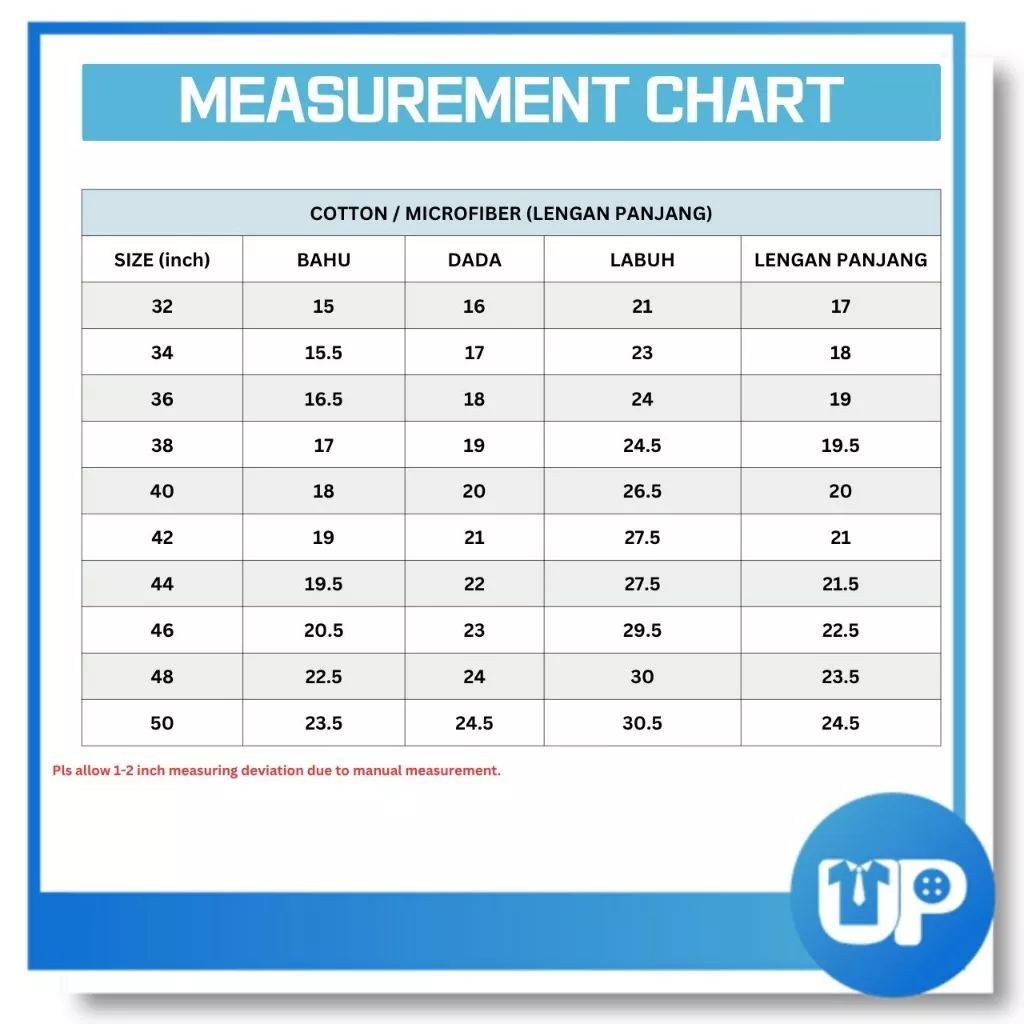 Code: SSKB Material:Microfibre Lengan: Pendek Size: 40-48 Code: LSKB Material: Microfiber Lengan: Panjang Size: 40-48 ⚠ Disebabkan perbezaan monitor dan pencahayaan, warna sebenar item mungkin sedikit berbeza daripada yang ditunjukkan dalam gambar. ⚠ Sila benarkan penyimpangan ukuran 1- 2cm / 1-2inci disebabkan oleh pengukuran manually.