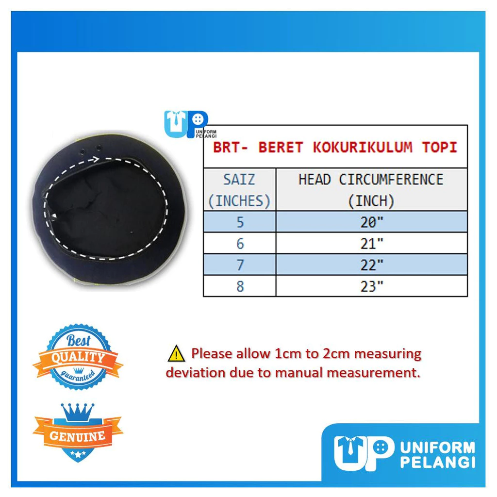Code: SETBR Material: Wool Size: 5, 6, 7, 8 Condition: New Packaging: Full Set Quality: Premium Suitable : Kokurikulum Sekolah Advantages : Breathable, Adjustable, Comfortable ⚠ Disebabkan perbezaan monitor dan pencahayaan, warna sebenar item mungkin sedikit berbeza daripada yang ditunjukkan dalam gambar. ⚠ Sila benarkan penyimpangan ukuran 1- 2cm / 1-2inci disebabkan oleh pengukuran manually.