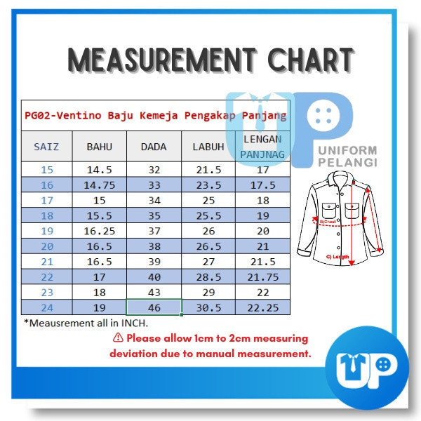 Size Baju: 14 - 22 Code: PG02 Material: Cotton TC Pocket: 2 pockets Cutting: Regular fit Brand: Dexwin Quality: Good Condition: Brand New ⚠ Disebabkan perbezaan monitor dan pencahayaan, warna sebenar item mungkin sedikit berbeza daripada yang ditunjukkan dalam gambar. ⚠ Sila benarkan penyimpangan ukuran 1- 2cm / 1-215inci disebabkan oleh pengukuran manually.