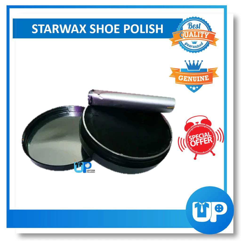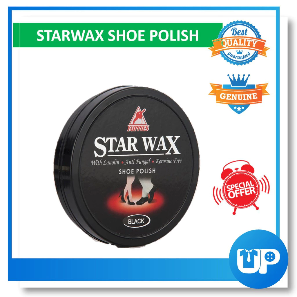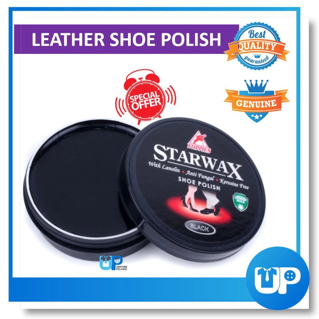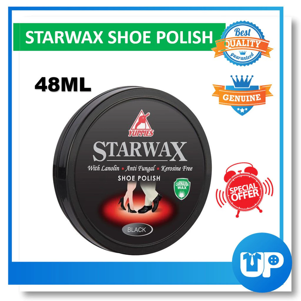 STARWAX SHOE POLISH PASTE Volume: 48ml / 100ml Brand: Yuppies Barcode: Black( 9557458 542268 ) Material: Leather Color: Black / Hitam Suitable for : Black Leather shoes / PVC shoe/ Kasut Kulit ⚠ Disebabkan perbezaan monitor dan pencahayaan, warna sebenar item mungkin sedikit berbeza daripada yang ditunjukkan dalam gambar. ⚠ Sila benarkan penyimpangan ukuran 1- 2cm / 1-2inci disebabkan oleh pengukuran manually.