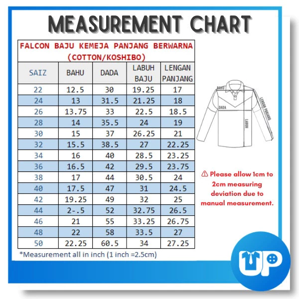 Brand: Falcon Color: Light Yellow/ Kuning Size: 24 - 46 Code: 312Y/EX Type: Long Sleeve/ Lengan Panjang Material: Cotton ⚠ Disebabkan perbezaan monitor dan pencahayaan, warna sebenar item mungkin sedikit berbeza daripada yang ditunjukkan dalam gambar. ⚠ Sila benarkan penyimpangan ukuran 1- 2cm / 1-2inci disebabkan oleh pengukuran manually.
