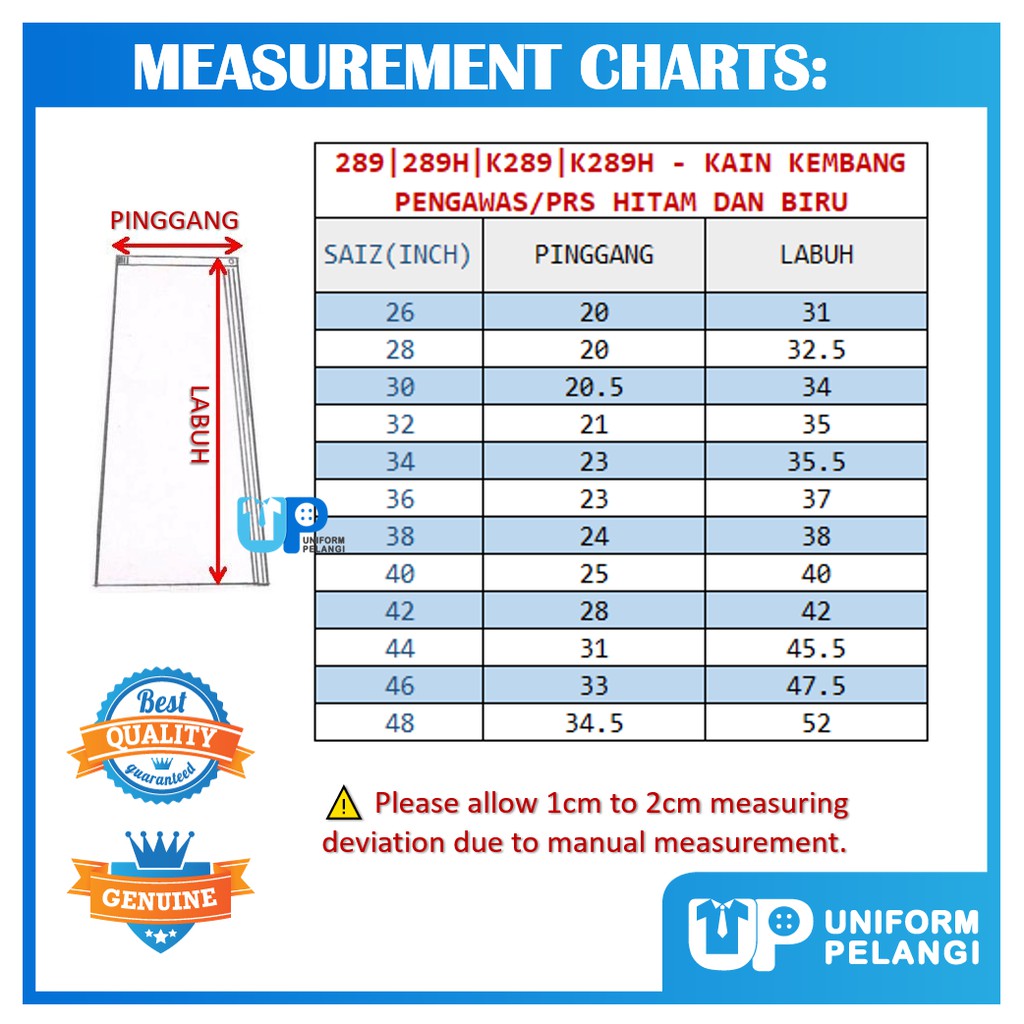 SIZE : 26-48 Code:289H | K289H Material: Viscose | Koshibo Color: Hitam Cutting: Regular fit Brand: Falcon ⚠ Disebabkan perbezaan monitor dan pencahayaan, warna sebenar item mungkin sedikit berbeza daripada yang ditunjukkan dalam gambar. ⚠ Sila benarkan penyimpangan ukuran 1- 2cm / 1-2inci disebabkan oleh pengukuran manually.
