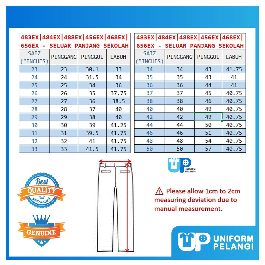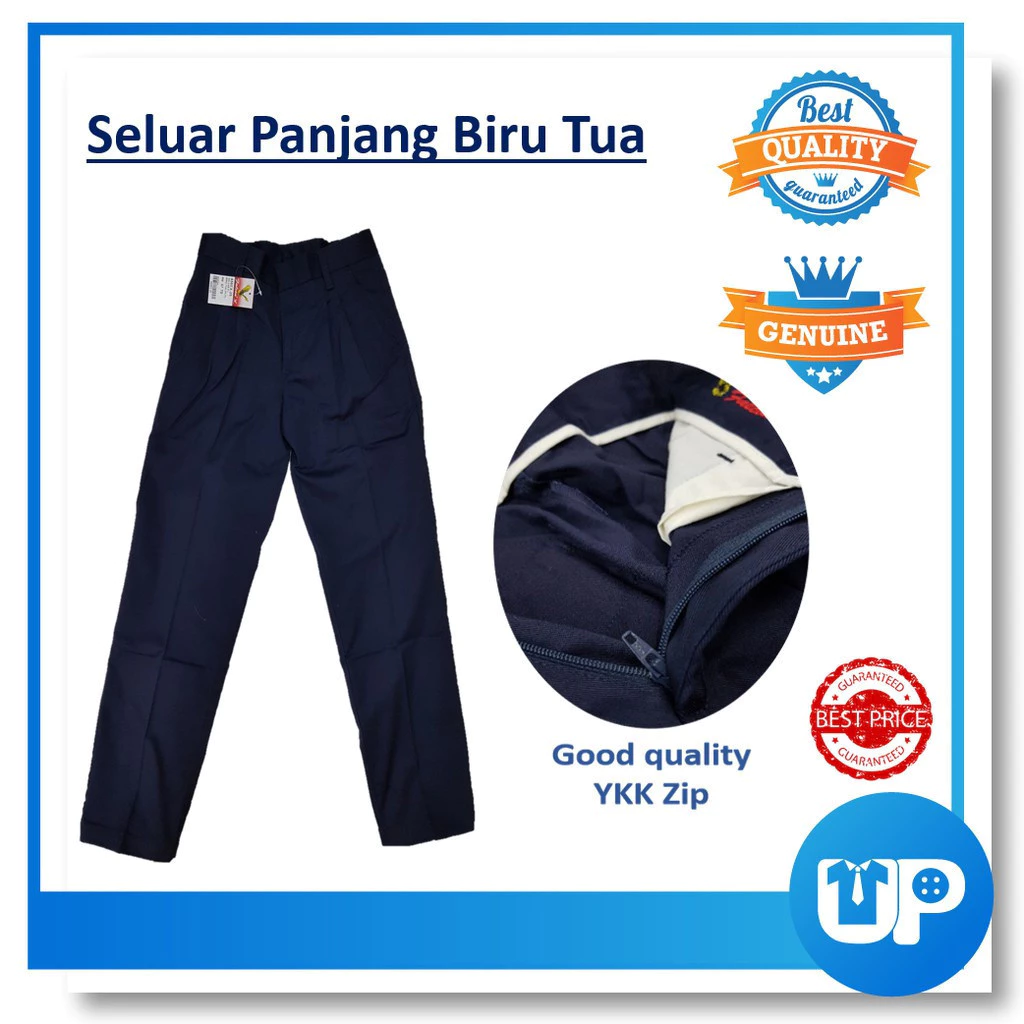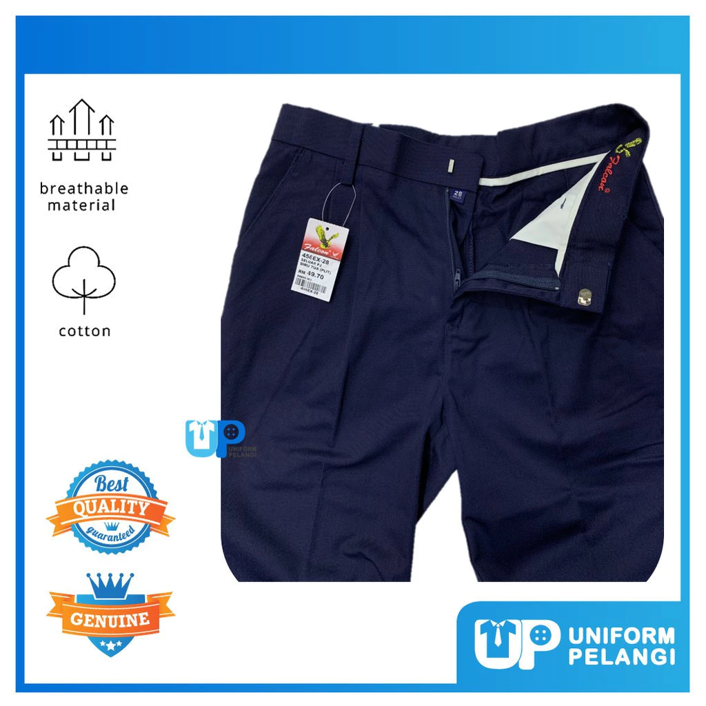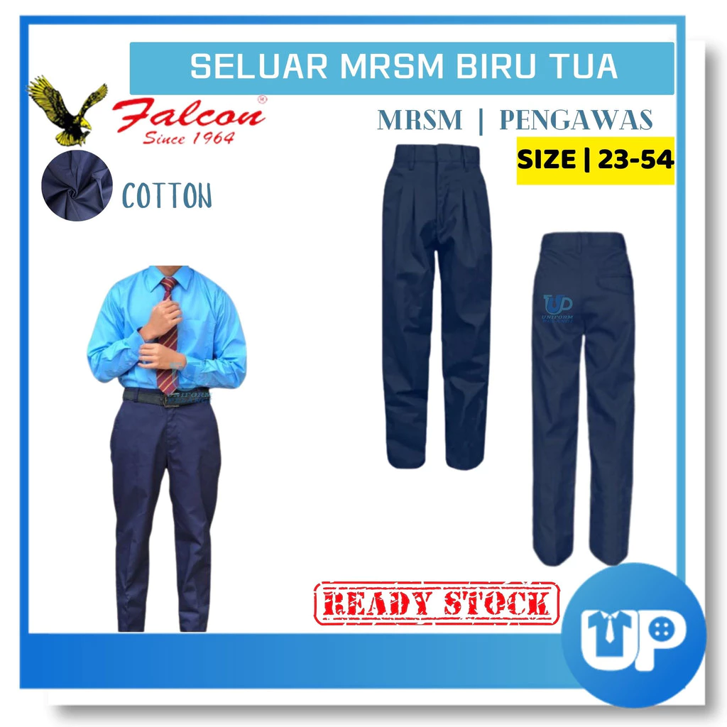 Brand: Falcon Size: 23, 24, 25, 26, 27, 28, 29, 30, 31, 32, 33, 34, 35, 36, 37, 38, 40, 42, 44, 46, 48, 50, 52, 54 Age: Primary & Secondary school age / MRSM Code: 456EX Quality: Premium Material: Cotton Color: Dark Blue / Biru Tua Cutting: Regular Fit & Tiada Bergetah Condition: New ⚠ Disebabkan perbezaan monitor dan pencahayaan, warna sebenar item mungkin sedikit berbeza daripada yang ditunjukkan dalam gambar. ⚠ Sila benarkan penyimpangan ukuran 1- 2cm / 1-2inci disebabkan oleh pengukuran manually.